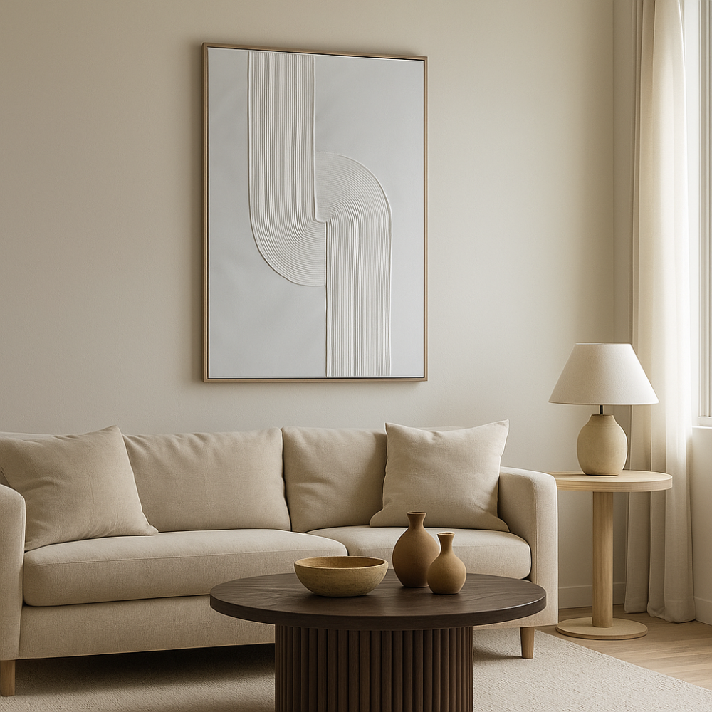 لوحة فنية تجريدية بتصميم بسيط وأنيق، تجمع بين اللمسات الحديثة والتفاصيل الهادئة التي تضيف طابعًا من الفخامة والرقي لأي مساحة. تتميز بخطوط بارزة بتقنية ثلاثية الأبعاد تعكس حسًّا فنيًّا راقياً يناسب المنازل ذات الطابع العصري أو الكلاسيكي البسيط. الإطار الخشبي الفاتح يمنح اللوحة لمسة من الفخامة ويجعلها قطعة مميزة على أي جدار